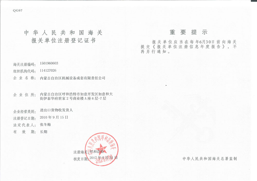 海關(guān)報關(guān)單位注冊登記證書