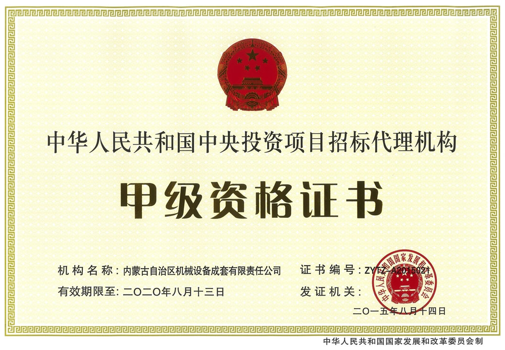 中央投資項目招標(biāo)代理機構(gòu)甲級資格證書